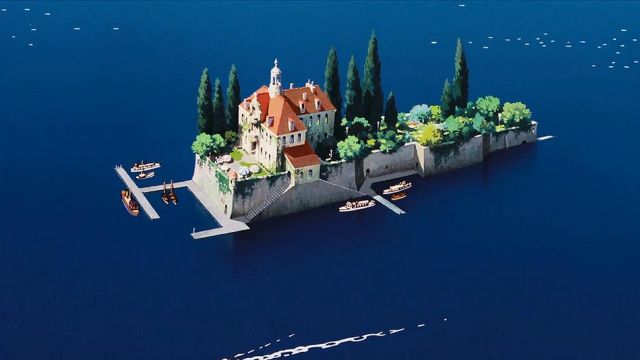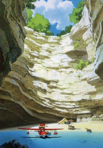 The opening shots of Porco Rosso (1992), written and directed by Hayao Miyazaki, are a masterclass in economical storytelling. We begin with a shot of a blue sky, glimpsed from within a ravine. The camera tilts down the ravine cliffs to reveal a small cove on the ground below. Moored in the waters lapping at the cove’s beach is a bright red seaplane. There’s a small encampment on the beach, and a man sleeps in a beach chair. As we get a closer look at the plane, we see that the Italian flag is painted on its tail.