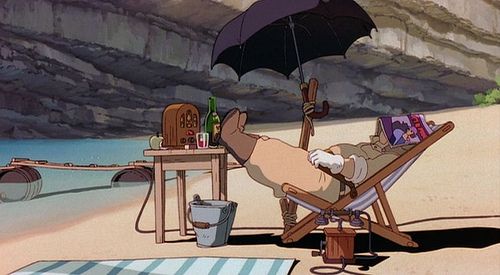 A favorite humanizing detail in Porco Rosso is harder to identify, perhaps because the characters and situations are generally so much larger than life. Still, I might choose one detail from the opening scene: as he dozes, Marco uses his legs to pull the table on which his feet have been propped up a little closer to him. It’s a nice bit of indolent body language.