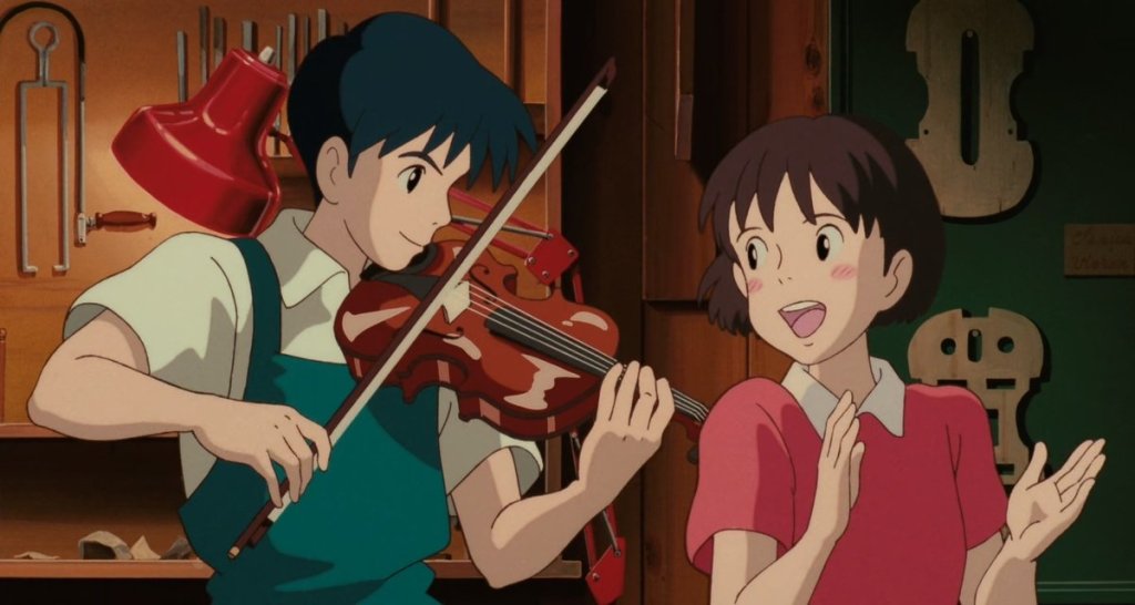 By far the best scene in Whisper of the Heart, however, which brings together the themes of love and artistry beautifully, is a scene involving Shizuku, Seiji, and Mr. Nishi. The lower level of Mr. Nishi’s store serves as a workshop where Seiji practices his violin making. One evening, he and Shizuku hang out in the workshop as Seiji works. Shizuku asks him to play something for her on the violin. Initially irritated, Seiji accepts the challenge and turns it around: Shizuku must sing along. He then begins playing “Country Roads” on his violin.
