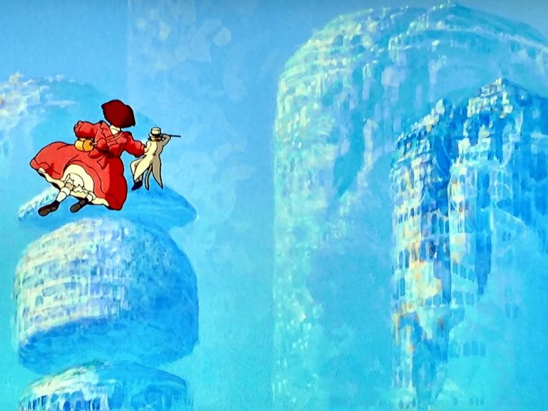 My choice for favorite image in Whisper of the Heart is a great shot that blends together Shizuku’s novel with her real life. We see the novel’s scene of Shizuku and the Baron flying through the sky, headed toward the horizon. Then the camera tilts down to reveal, at ground-level, the real Shizuku running excitedly down a hill as she makes up the story. The shift from imagination to reality within a single shot perfectly captures her state of mind, while the sight of (once again) the city spread out before the running girl reflects the vistas that her new creative endeavor has opened before her.
