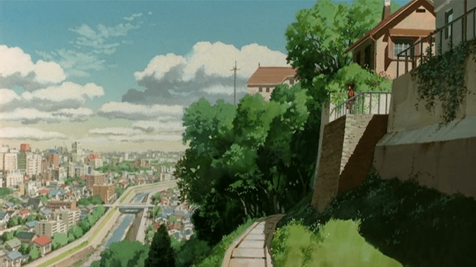 Moreover, having this rather idyllic-looking city serve as the backdrop for our imaginative heroine’s sometimes serendipitous adventures makes Shizuku’s urban environment seem as magical as the countryside does in Totoro. Watching Shizuku pursue the white cat down an alleyway made me think of Mei pursuing the miniature Totoros through the forest underbrush.