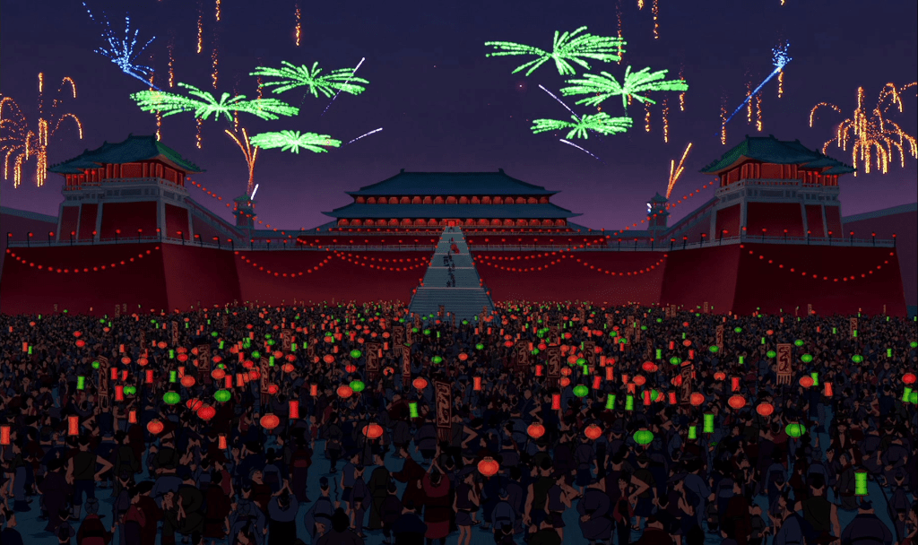 The final climactic sequence in the Imperial City also features striking animation. Again, different techniques are blended to create huge spaces filled with crowds, and we get an array of fireworks in this sequence, as well. (I also liked the detail of how Mulan uses a fan as an improvised set of nunchakus.)