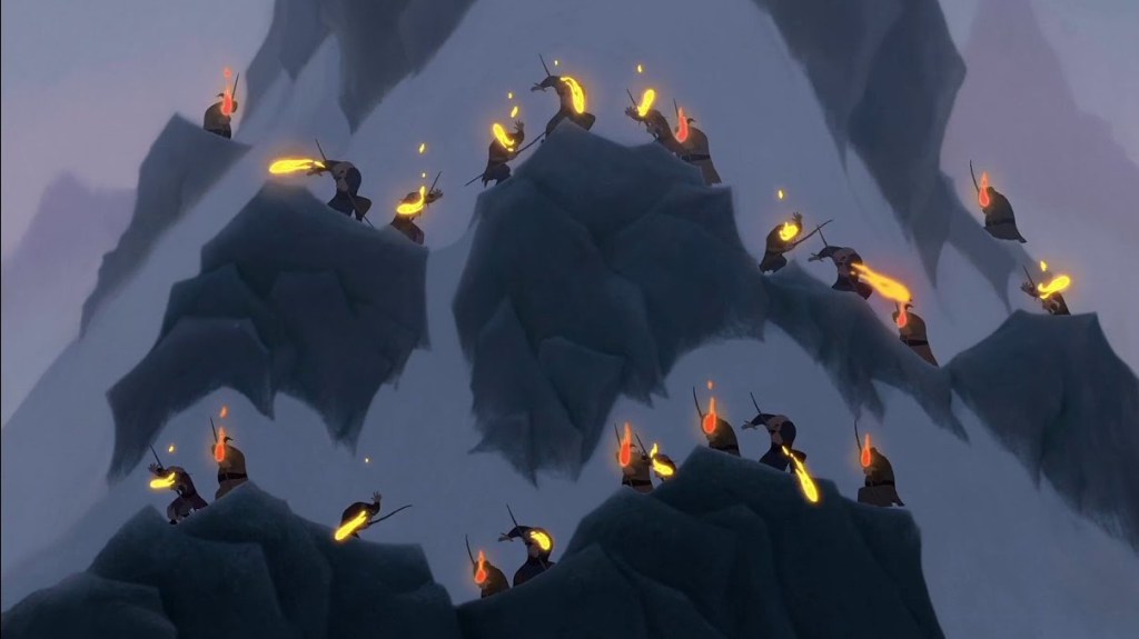 The skills on display in all these little moments prepare us for an important scene later where Mulan figures out how to use the geography of her surroundings to win a seemingly hopeless battle.
