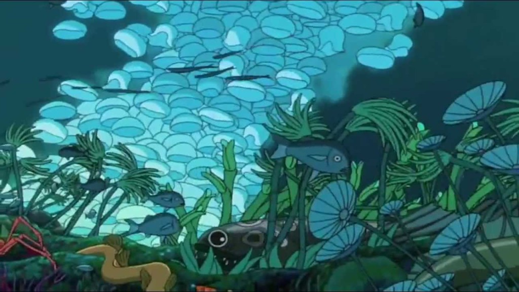 Fujimoto has an aquarium full of his offspring, who are meant to be fish but are animated to look rather like little girls in red dresses. The largest, presumably most mature, of these daughters is an adventurous sort and she ventures outside Fujimoto’s craft into the wider ocean.