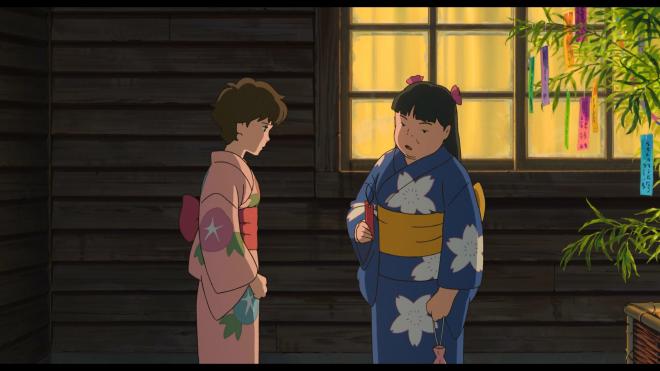 This thoughtful characterization extends to a character who in a different kind of movie would be an easy target for lampooning. A local whom Anna encounters is Nobuko, a bossy, large-bodied girl who seems to be the dominant personality among the village’s kids. Nobuko leads the detachment of girls at the Tanabata Festival and annoys Anna with her nosy, overbearing behavior. Yet when Anna finally loses her temper and snaps at Nobuko, insulting her weight, Anna is clearly the one who has crossed a line and is at fault. Also, the writers give Nobuko a refreshing reaction to the insult: in a matter-of-fact way, she insults Anna back and then lets her know she is still welcome to hang out with Nobuko and the other girls the following week.