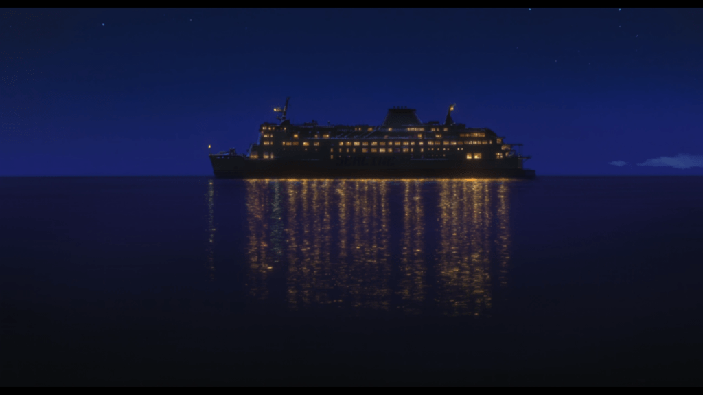 The result looks wholly different from previous Ghibli movies and anime generally. Goro Miyazaki and his team lean hard into animation’s potential for exaggeration and caricature, as with Bella’s voluptuous figure, the Mandrake’s elongated frame, and the tangled profusion of curly hair on many characters. The animators also have fun with portraying the Mandrake’s quick temper: when he is angered, his dark glasses spontaneously reflect sparks.