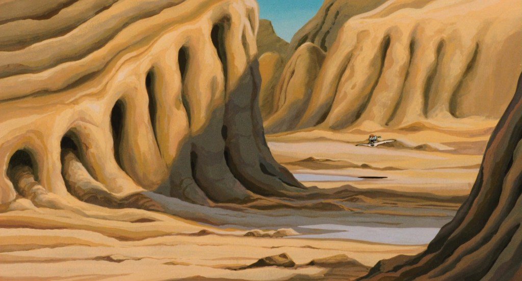 The action constantly shifts from one distinct place to another, whether it is the Jungle’s dark, tangled interior; the bucolic Valley of the Wind, with its orchards, crop rows, and windmills; a desert spotted with wreckage and Ozymandias-like statuary; or an eerily peaceful petrified forest in which Nausicaä briefly finds refuge. Although the story’s fast pace prevents the movie from spending too much time in any of these locations, the filmmakers give each of them a sense of history: they feel like places where other stories have occurred or could occur.