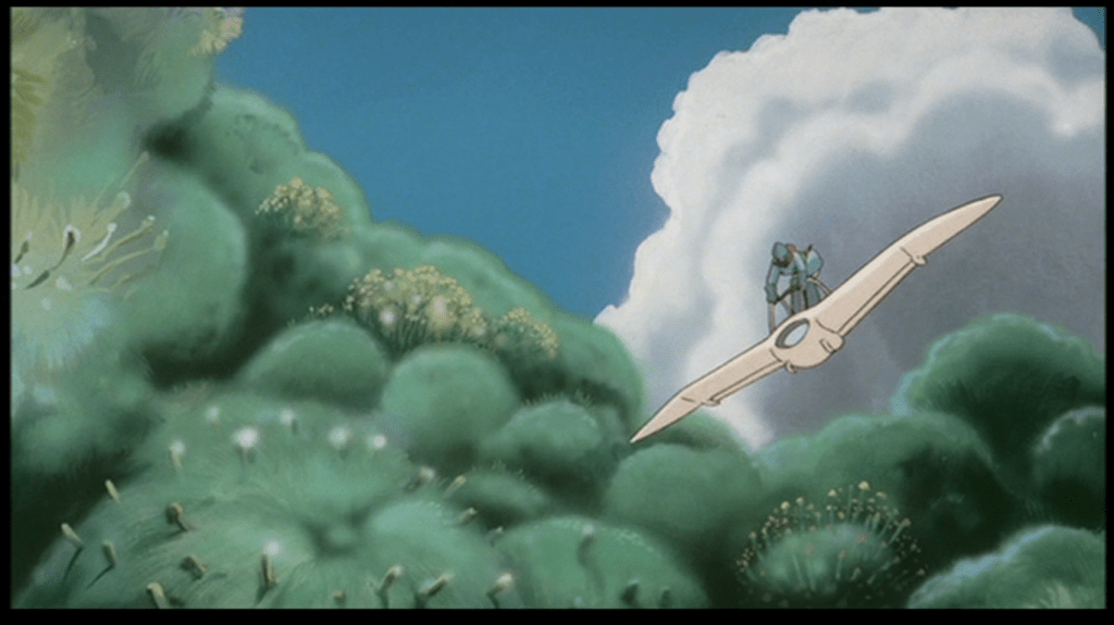 As she works, the trees release a shower of spores. Being protected from the spores’ lethal effects, Nausicaä pauses to contemplate their snowfall-like beauty. She is soon off again on her glider, though, carrying the deceased Ohm’s eye, which resembles an enormous circular window.