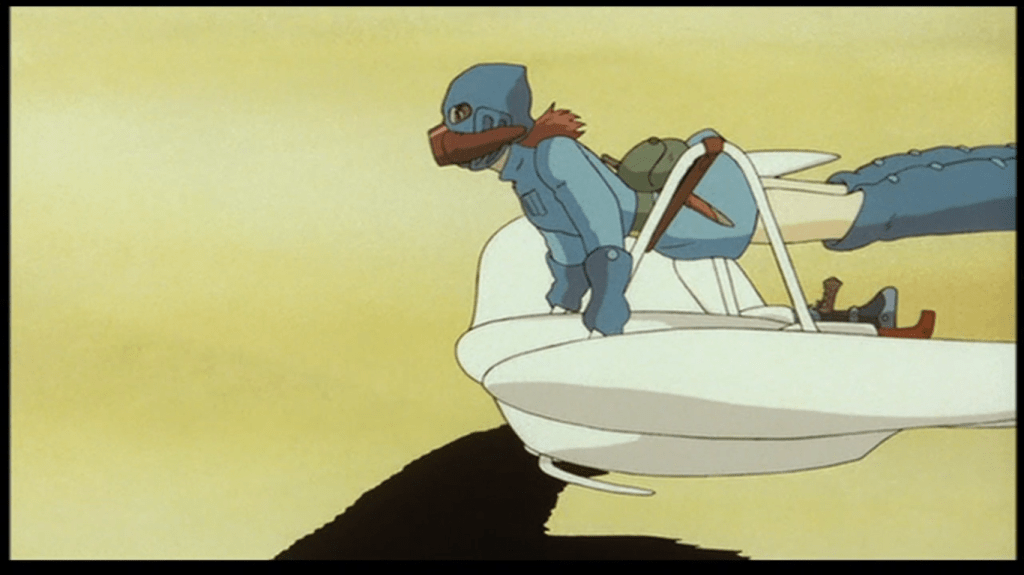 As all these battles and fights might suggest, Nausicaä of the Valley of the Wind is an unusually violent entry in Miyazaki’s body of work. I am not sure of the total body count, but it is astonishingly high. The movie is mostly free of blood or gore (one of the more piercing moments is when a character’s injuries are not directly shown but we see Nausicaä reacting to them). But the frequent deaths of characters, combined with the many frightening creatures, make this one of Miyazaki’s darker, less kid-appropriate movies.