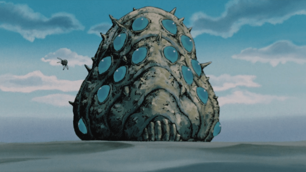 Aided by a gas mask and other protective gear, Nausicaä walks through the Jungle and comes upon the carcass of a dead Ohm. Realizing that her people can use the Ohm’s body parts for various purposes, she removes one of its compound eyes, using gunpowder to blast through the Ohm’s armor-like exterior.