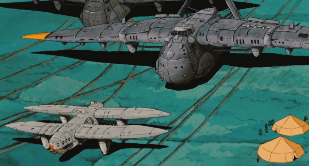 The human communities in the movie have an eclectic look that is appropriate for this post-apocalyptic world. People’s clothes and the castle where Nausicaä and King Jihl live seem vaguely medieval, but characters fight with firearms and tanks and fly in aircraft.