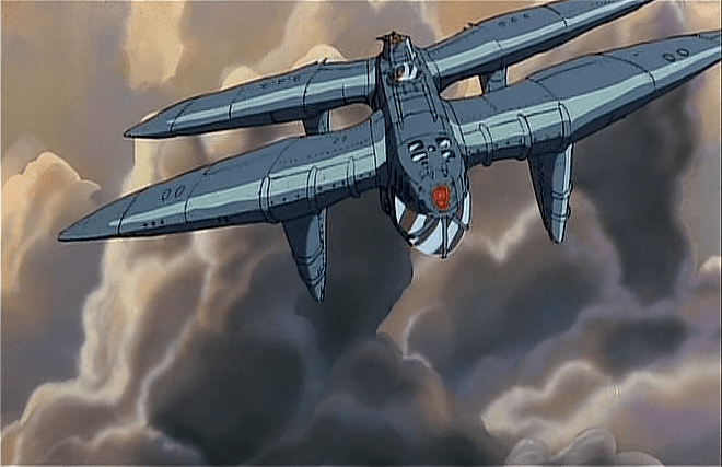 The existence of aircraft in this future world means that we get numerous scenes of flight, including chases and dogfights. Flight has always been Miyazaki’s passion, and the aerial scenes are rendered with the skill that would become his specialty.