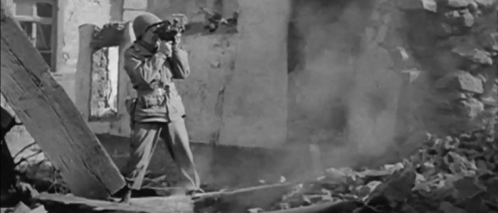 The series also includes plentiful film and audio clips from the many interviews all five directors gave over the course of their lives about their wartime work. We thus get a welcome sense of each man’s manner and personality: Wyler comes across as quietly good-humored; Ford is gruffly laconic; Capra, warmly expansive; Stevens is undemonstrative and slightly stolid; and Huston is the perpetually world-weary bon vivant (time spent listening to John Huston speak is always time well spent).