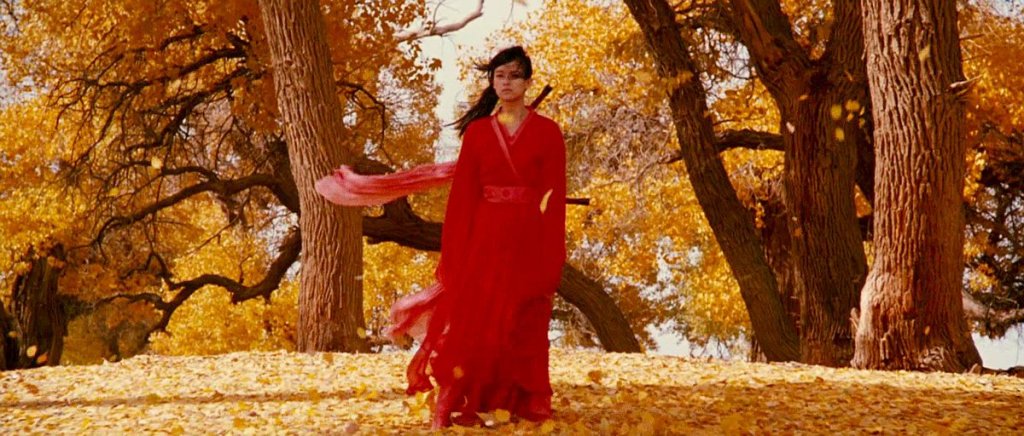 My favorite duels are probably a fight in the rain between Nameless and Sky (which gives the otherwise sadly under-used Donnie Yen a chance to show his skills) and one involving Broken Sword set in a chamber hung with curtains. I would give an honorable mention to a duel in the yellow wooded grove between Flying Snow and the young Moon (played by Crouching Tiger’s Zhang Ziyi).