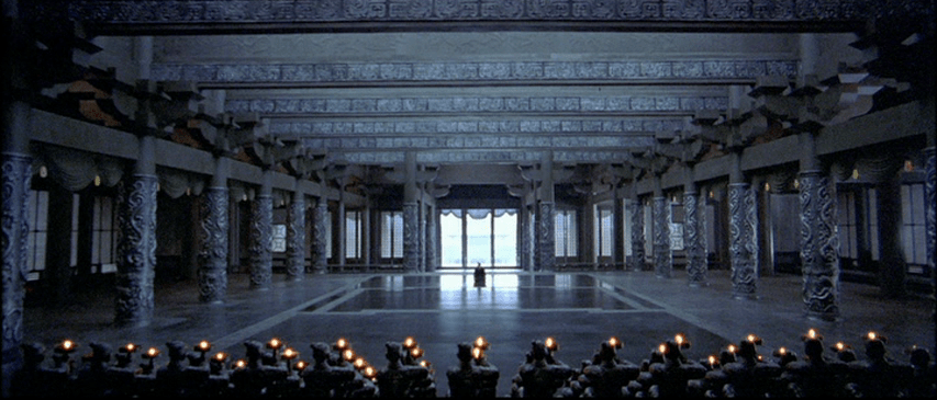 A calligraphy school described by Nameless is awash in blood red, provided by both the school’s décor and the students’ robes. Later, we return to the same setting and characters but now everything is celestial blue.