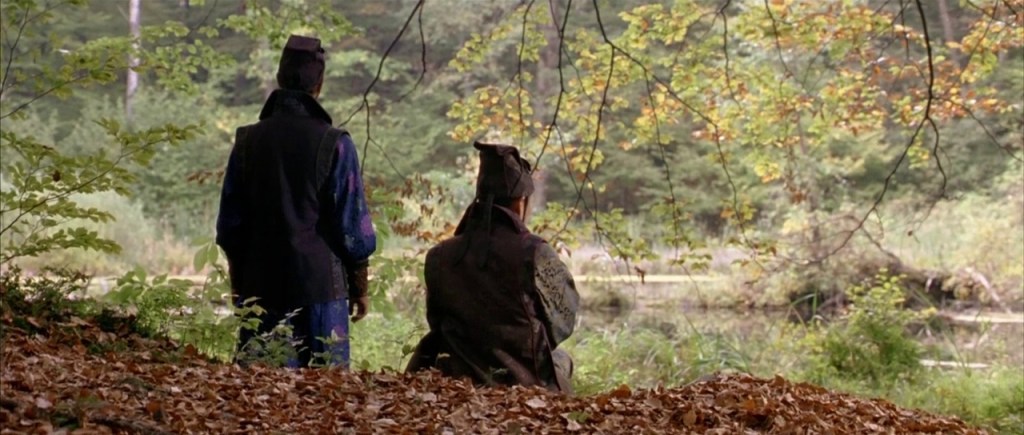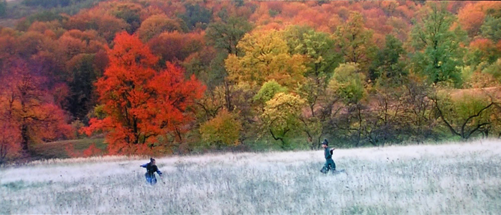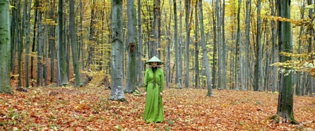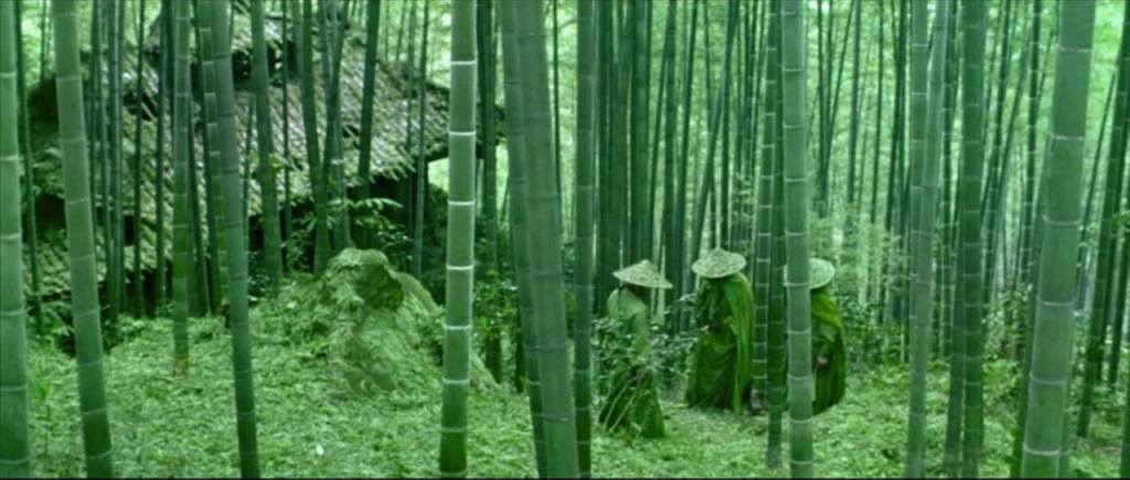 Most of the movie takes place outdoors, so we witness the profound green of the bamboo forest; the mixed greens, yellows, and reds of another forest slowly entering autumn; the golden shine of an open field of grass and wildflowers; and the white of birches and snow.