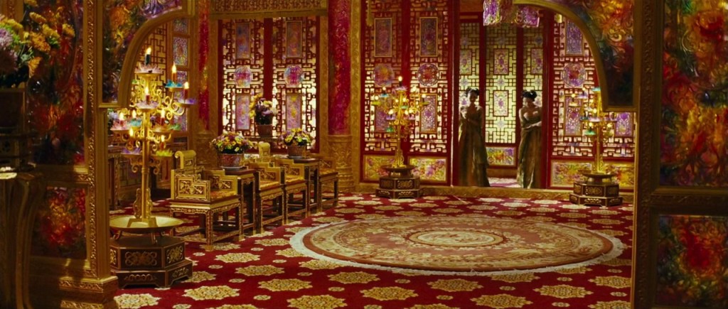 The production team’s greatest accomplishment is the imperial palace, probably the best location in a Zhang movie since the house in Raise the Red Lantern. Every inch of the palace is covered with vibrant color: plenty of gold, but also red, green, and yellow.